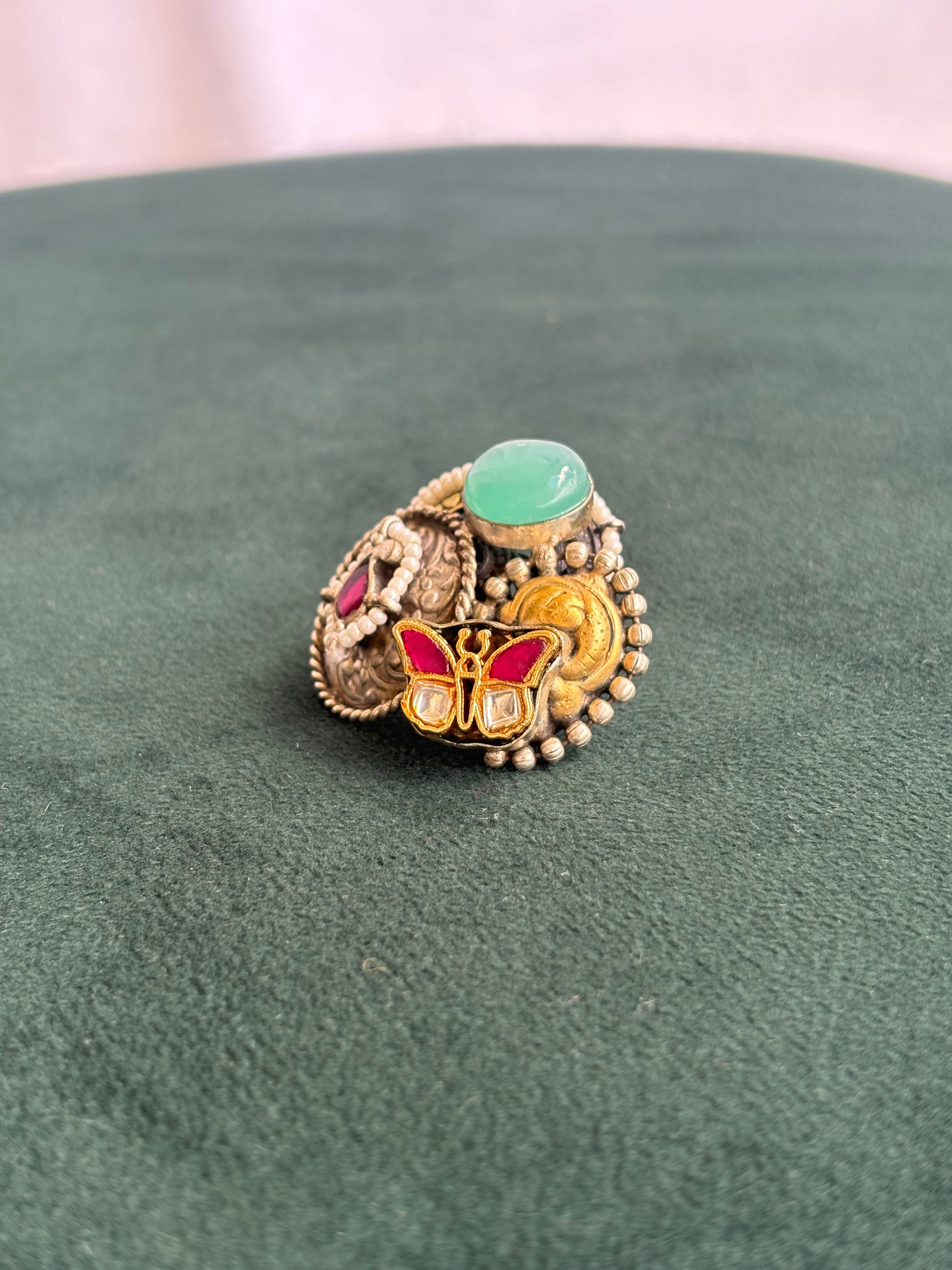 Introducing the "Adhya" Pachi-Kundan Ring, crafted with exquisite precision and adorned with stunning Pachi-Kundan stones. This elegant ring is a perfect blend of traditional and contemporary design, making it the ideal accessory for any occasion. Elevate your style and add a touch of luxury with the "Adhya" Pachi-Kundan Ring.