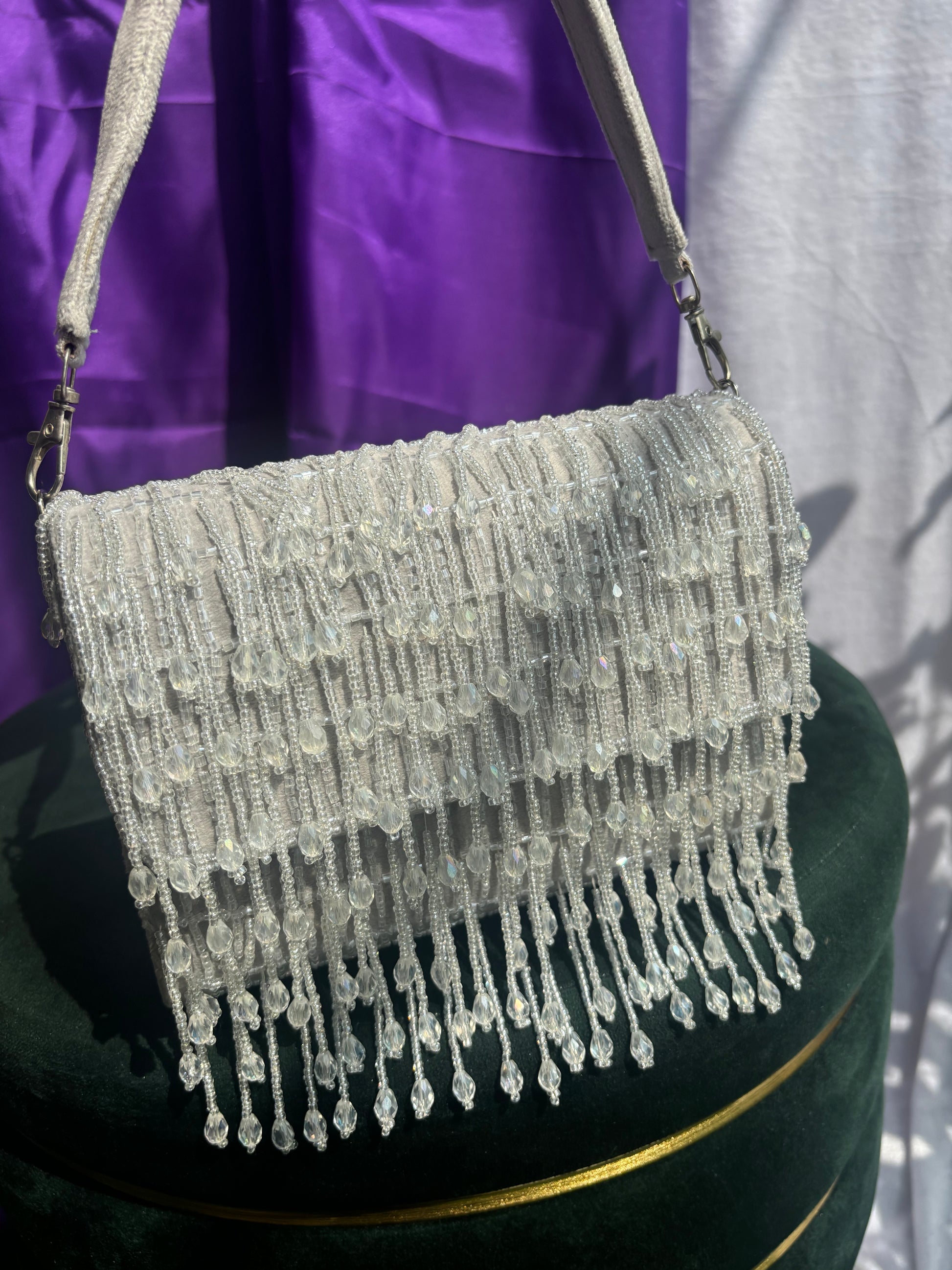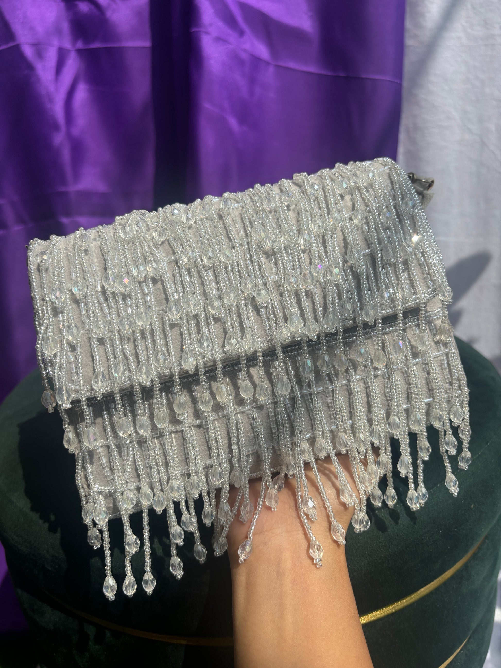 Elevate your style with Clutch-03, a luxurious and versatile accessory crafted with soft velvet and intricate tassel details. Perfect for any festive or wedding occasion, the included short belt with beadwork chain adds convenience and style. Make a statement with this stunning hand clutch.