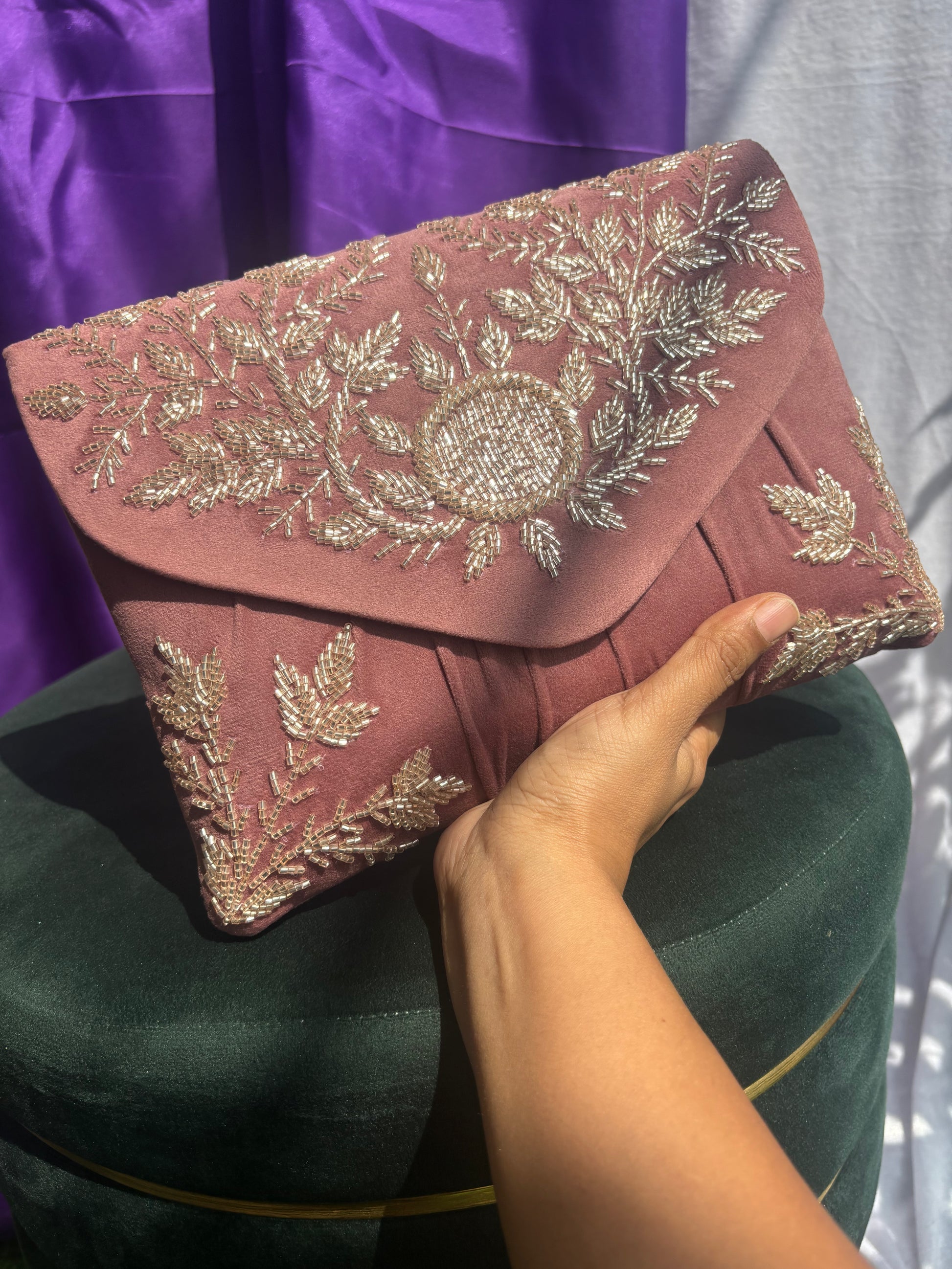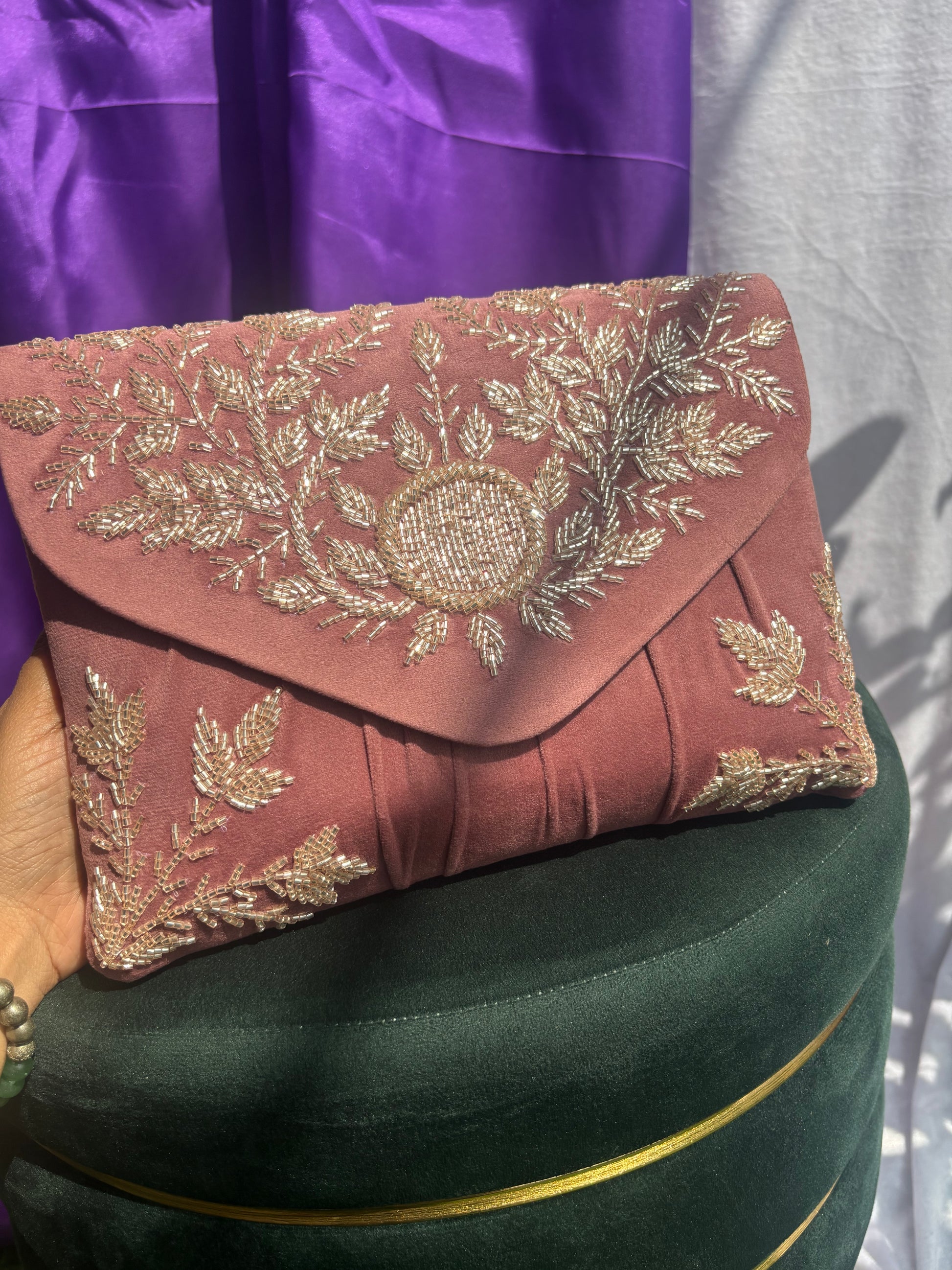 Transform your appearance with Clutch-05. This high-quality accessory is made with plush velvet and detailed with intricate embroidery, making it ideal for formal events. The included detachable chain adds both practicality and sophistication. Elevate your fashion and exude elegance with this striking hand clutch - a must-have addition to any wardrobe..