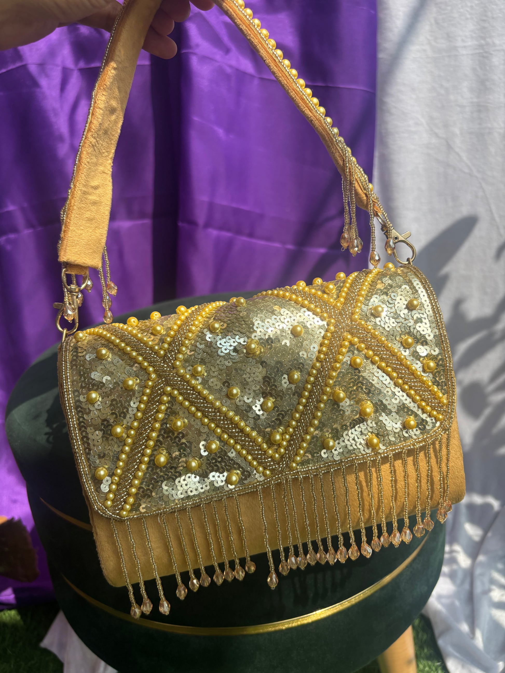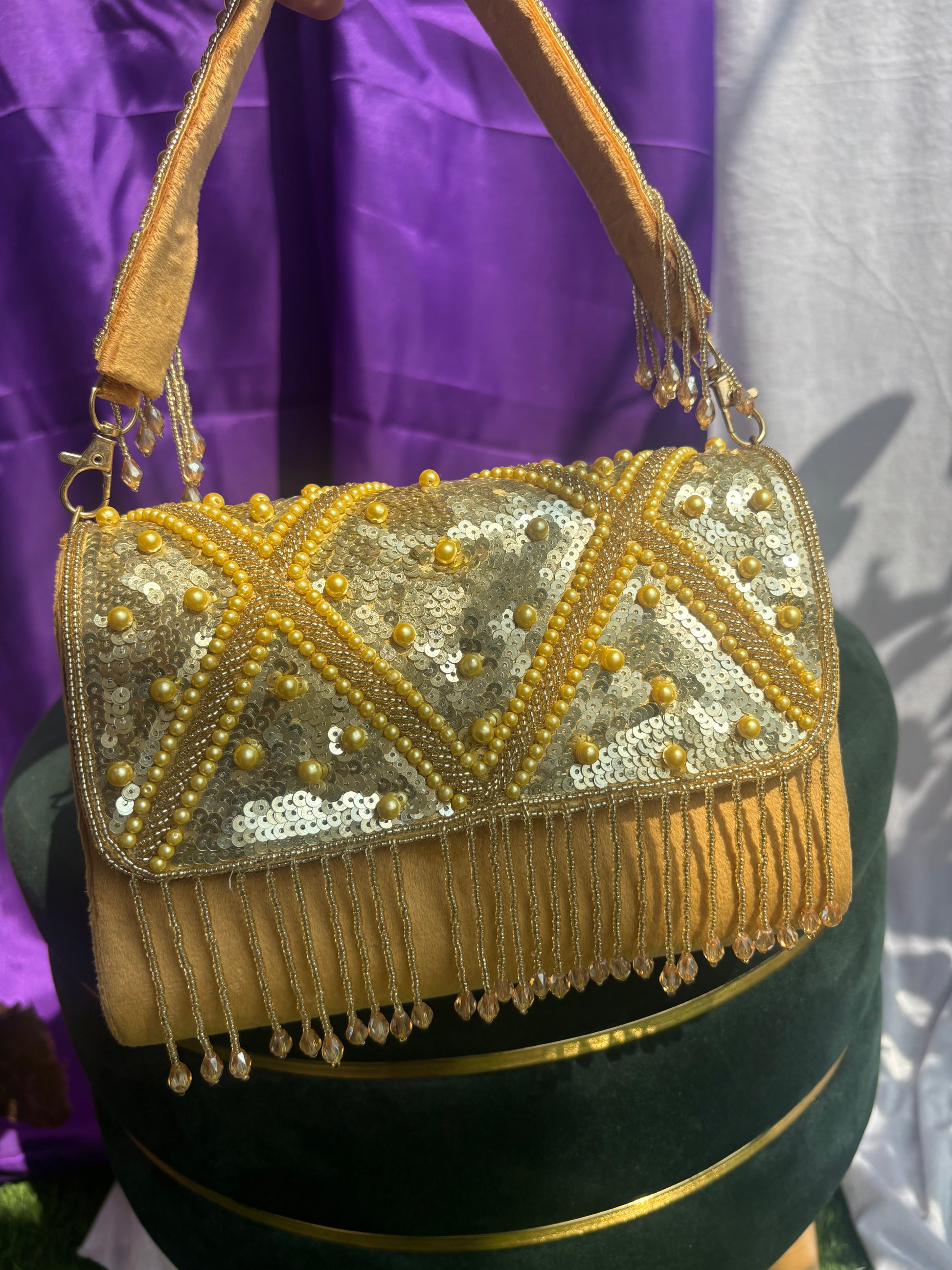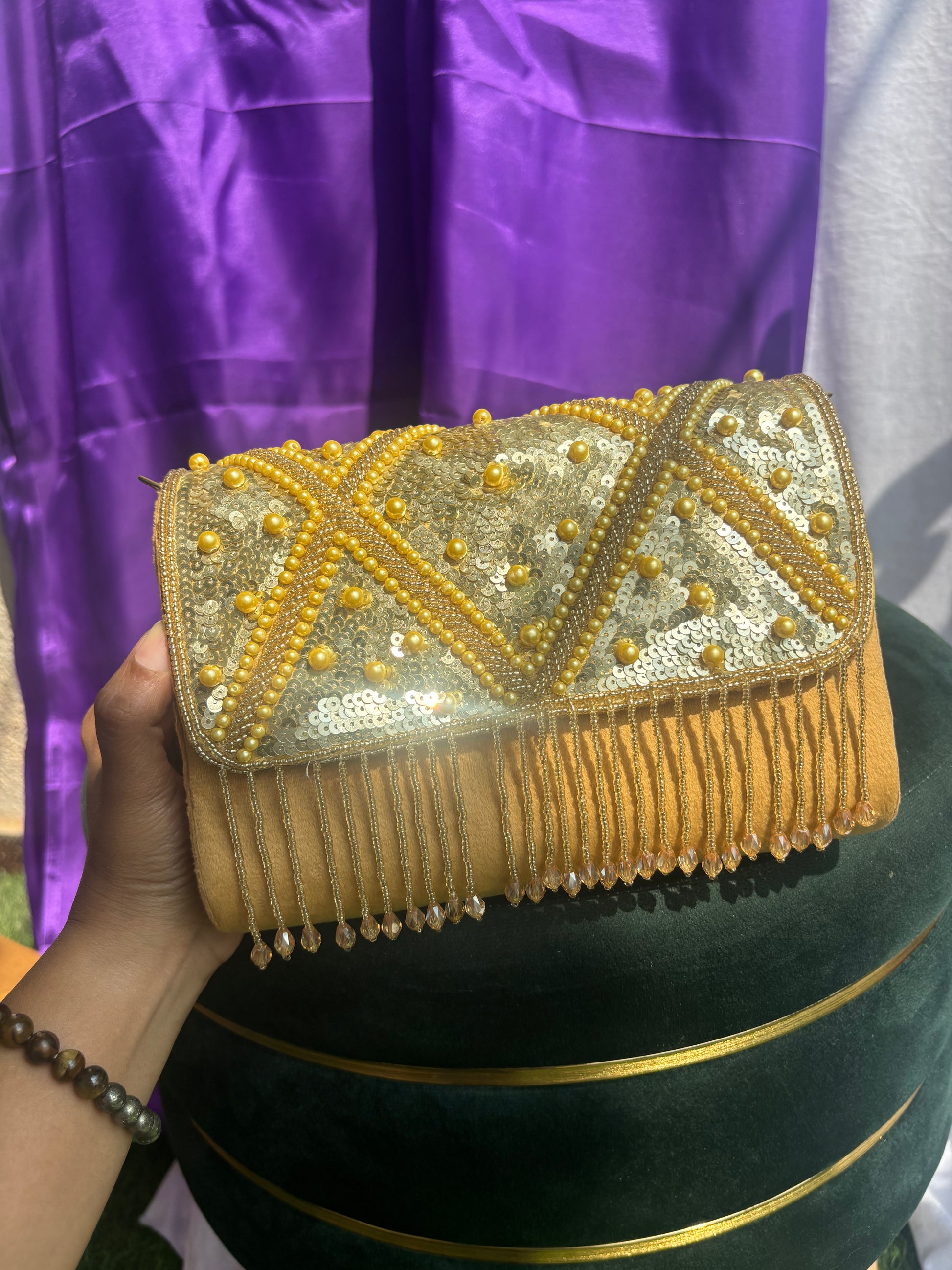 Elevate your style with the Clutch-08, a luxurious and versatile accessory perfect for festive or wedding events. Made with soft velvet, intricate tassel details, and stunning beadwork, this hand clutch is sure to make a statement. The included short belt with beadwork chain adds both convenience and style.