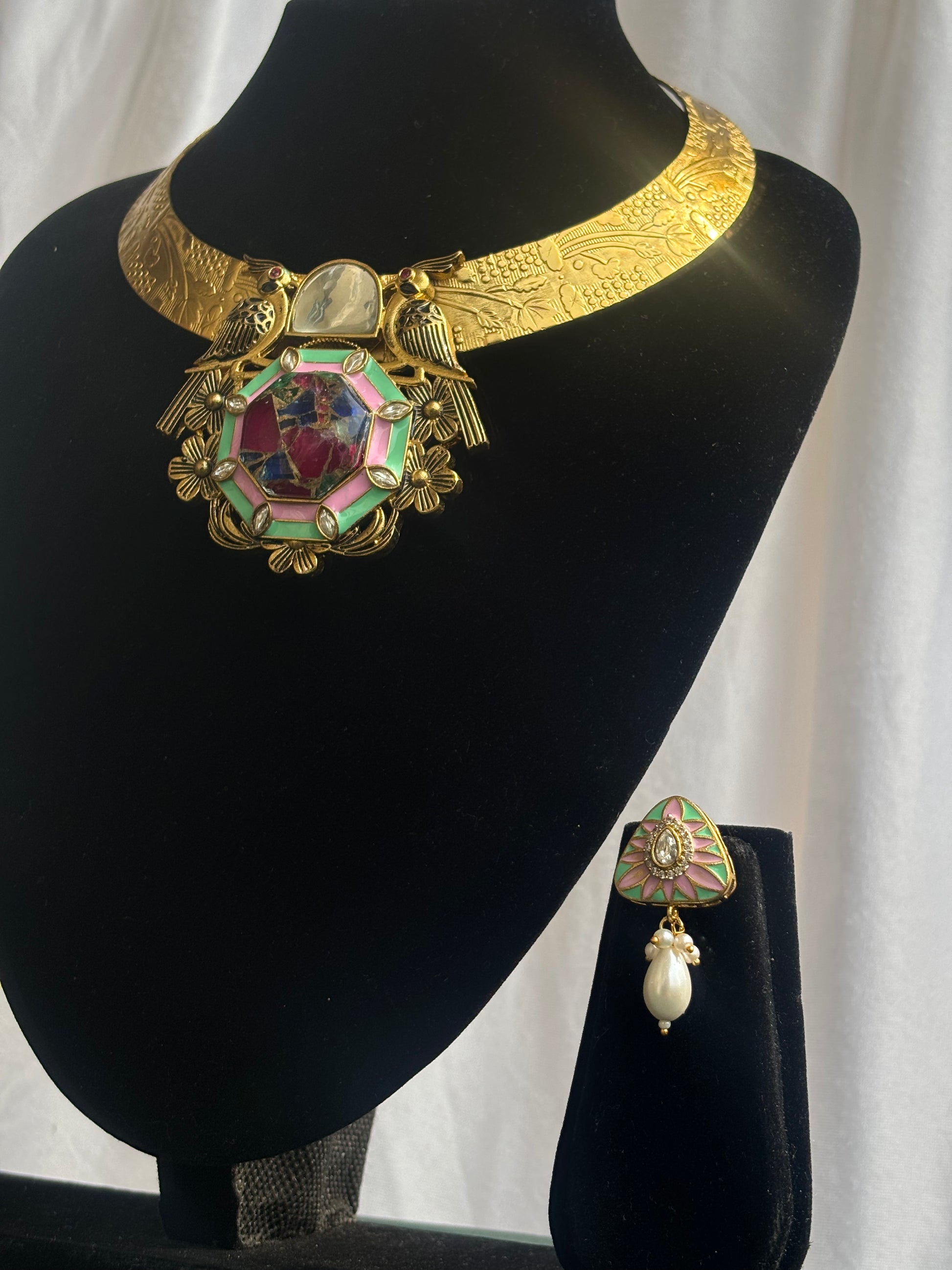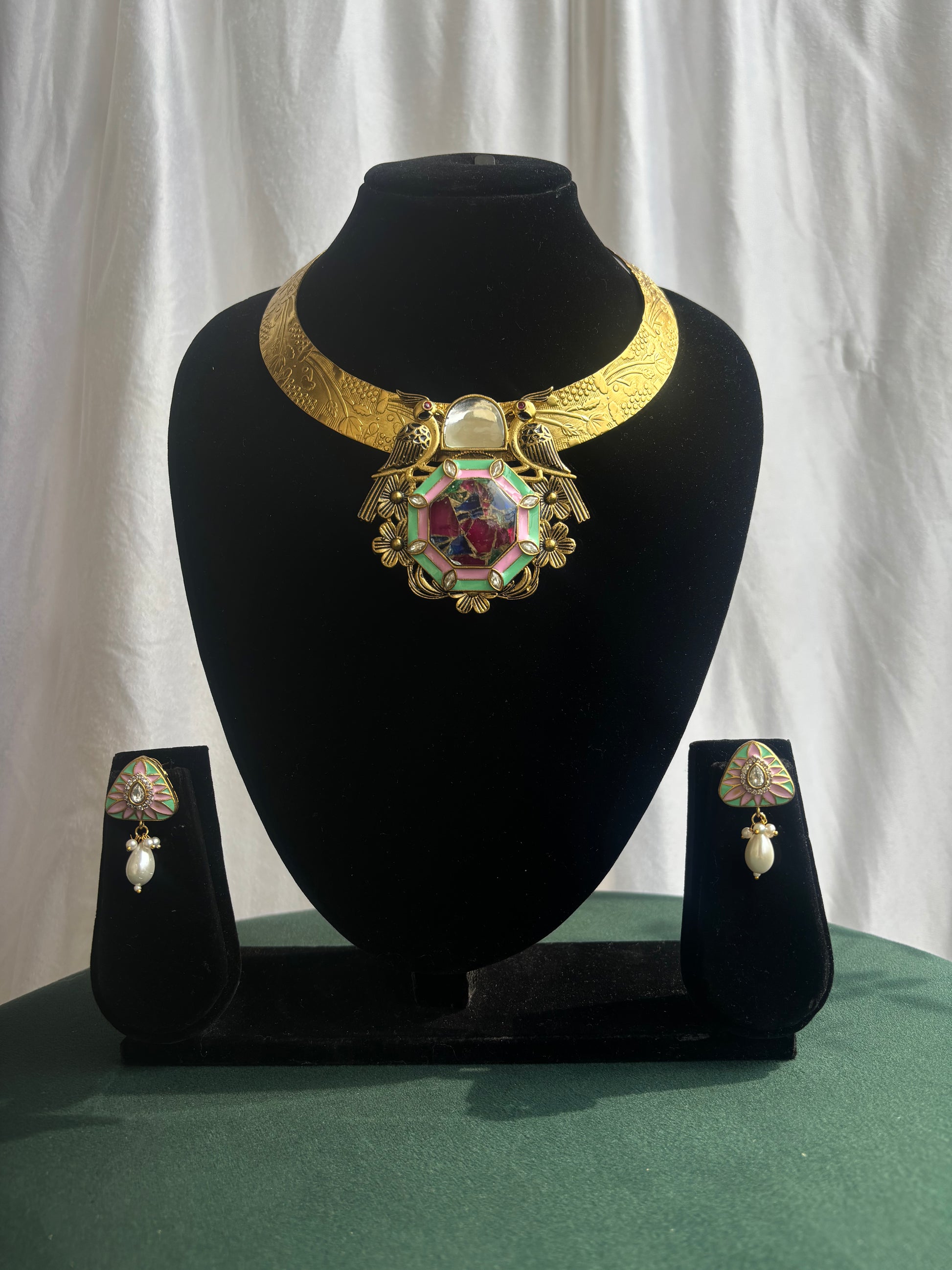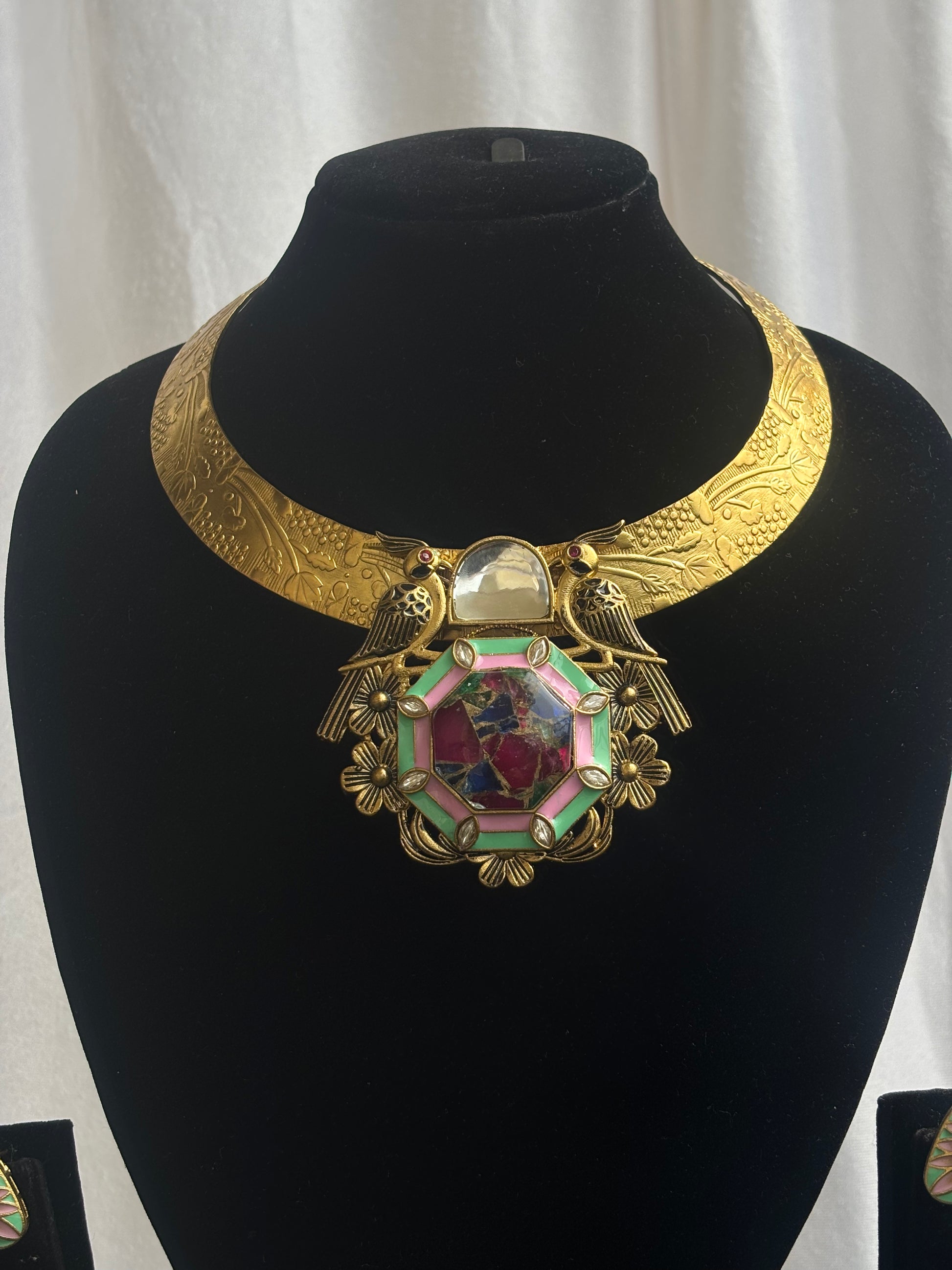 Experience elegance and tradition with the "Divya" Antique Hasli. This intricate necklace features a unique hasli design, perfect for adding a touch of culture to any outfit. Crafted with expert precision, this timeless piece is sure to be a showstopper. Embrace the beauty of Indian jewelry today.