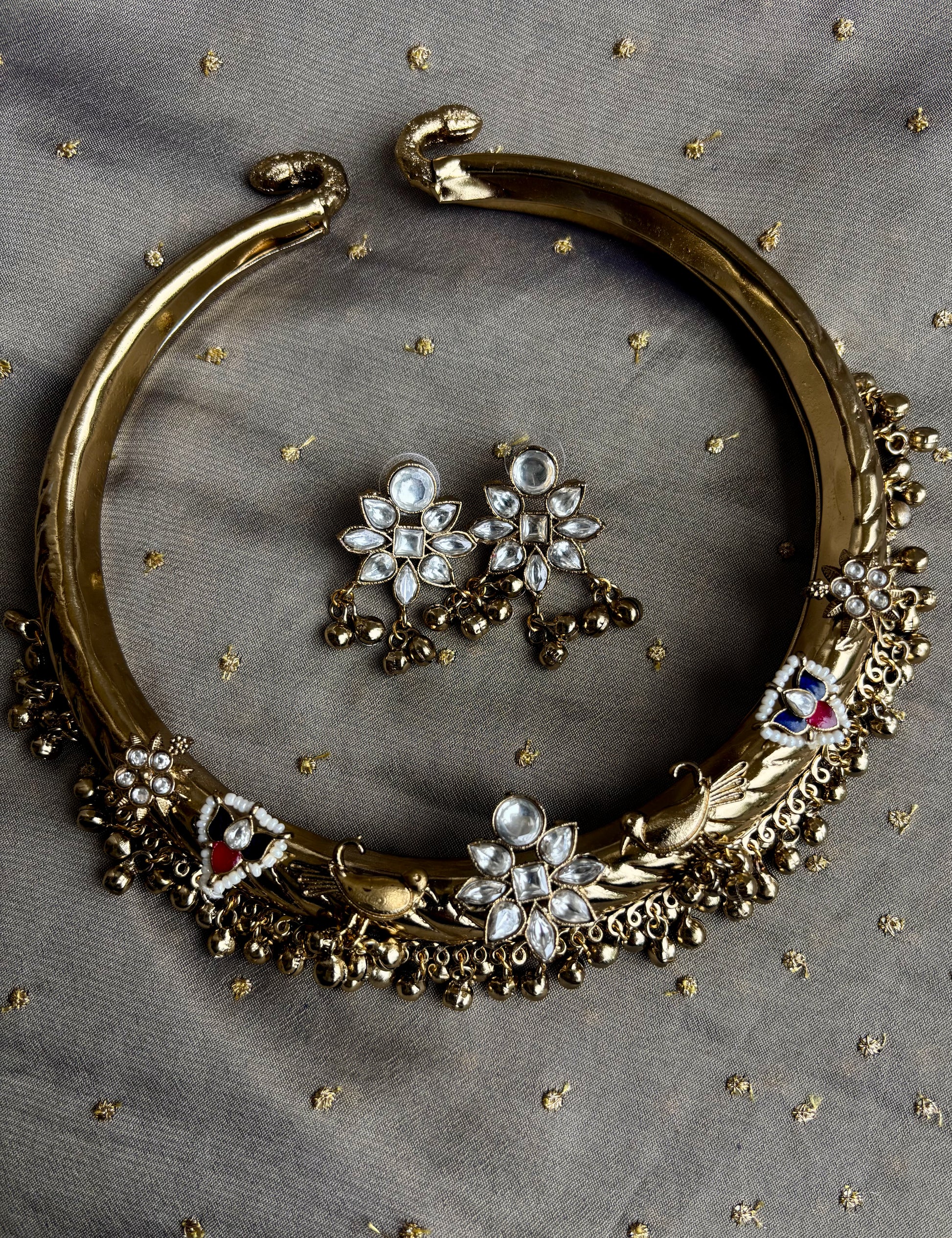 Elevate your elegance with the "Shikha" Hasli Necklace, a refined piece that blends traditional charm with contemporary sophistication. Its graceful ghunghroo accents add delicate movement and subtle sound, making it perfect for both festive occasions and everyday wear. Crafted to sit beautifully around the neck, this necklace complements any outfit with a timeless allure.