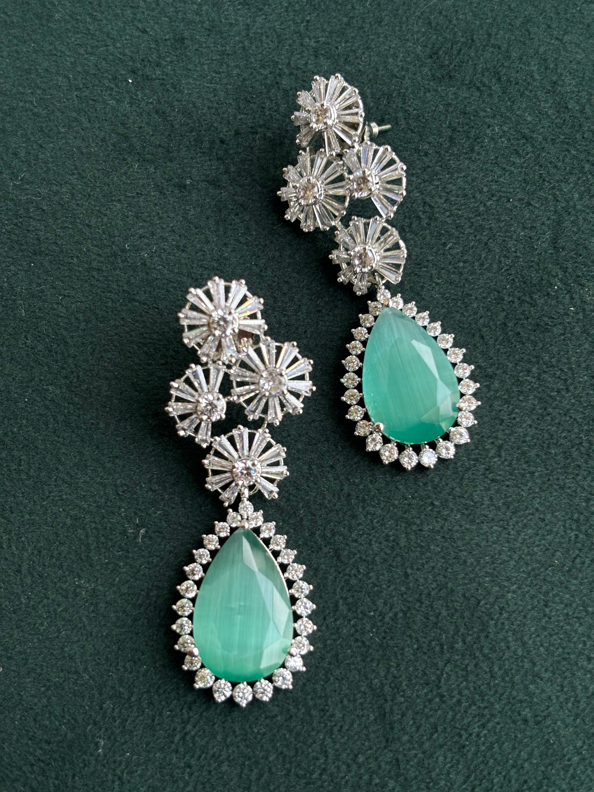 Introducing "Sofia" American Diamond Earrings. Illuminate your style with these stunning Danglers, handcrafted from silver and white-gold plated brass. With superior cubic zirconia stones, these earrings provide everyday elegance with a touch of floral brightness.